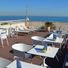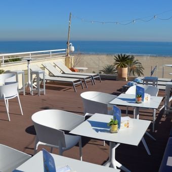 La Terraza del Miramar Rooftop sits on the fourth floor of a hotel building, providing an elevated dining space with sweeping panoramic views of Las Arenas Beach, the marina, and the Mediterranean Sea coastline.