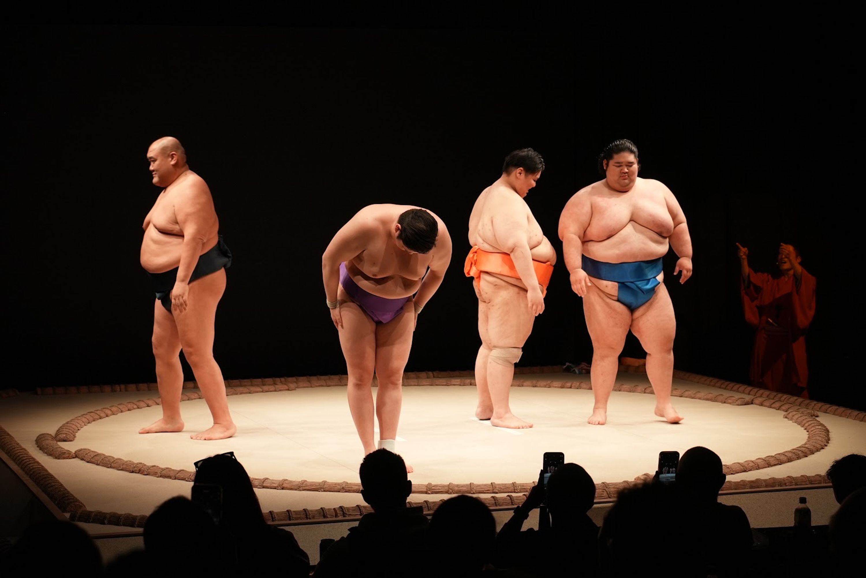 The Sumo Hall Hirakuza Osaka features live sumo performances by former professional wrestlers in a full-sized dohyo ring with multimedia effects including synchronized sound and lighting systems.