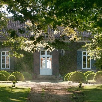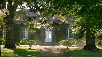 Lacquy Castle showcases typical 18th-century Gascon architecture with stone facades, traditional agricultural buildings, and surrounding vineyards extending across mossy oak forests in the Landes department.