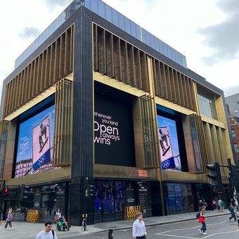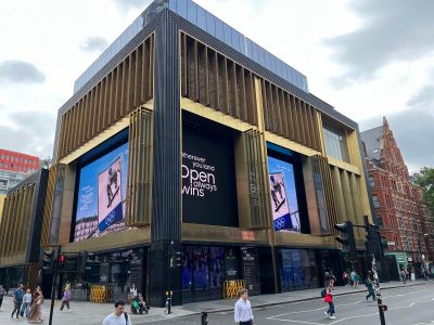 Outernet features the Now Building equipped with 8K high-definition LED screens creating immersive visual experiences and a LED tunnel called Now Arcade that connects high-tech indoor environments to Denmark Street's cultural heritage district.