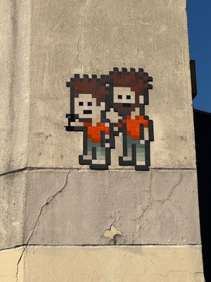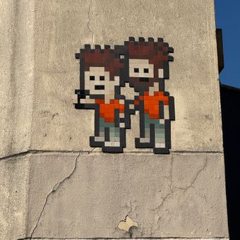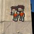 The mosaic shows two pixelated figures standing side by side. Both have brown hair, orange shirts, grey pants, and square shapes for features.