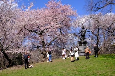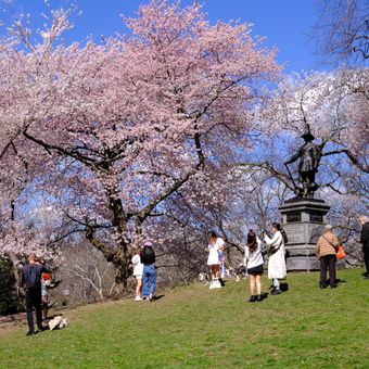 The cherry trees planted around the hill contrast with Frederick Law Olmsted's original design plans, which deliberately avoided flowering trees to maintain open park views.