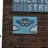 The mosaic features a blue shape resembling a flying saucer and yellow squares symbolizing lights, on a background made of light blue and white tiles. The piece is mounted on a brick wall.