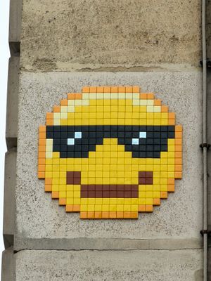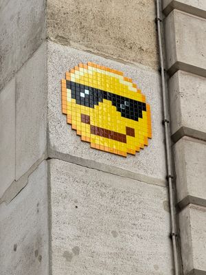 This work by Invader shows a round yellow face wearing black sunglasses and a smiling mouth, arranged using small square tiles. The facial features are created with black and brown tiles, and the white background makes the shape easy to see.