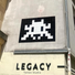 The piece shows a white, pixelated figure with two eyes and outstretched arms on a black square background made of small tiles.