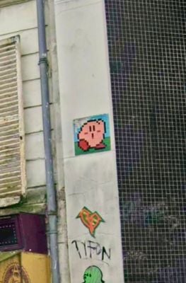 This mosaic shows a pink round Kirby character with small arms and feet. The character stands on green tiles with a blue background, made of square tiles.
