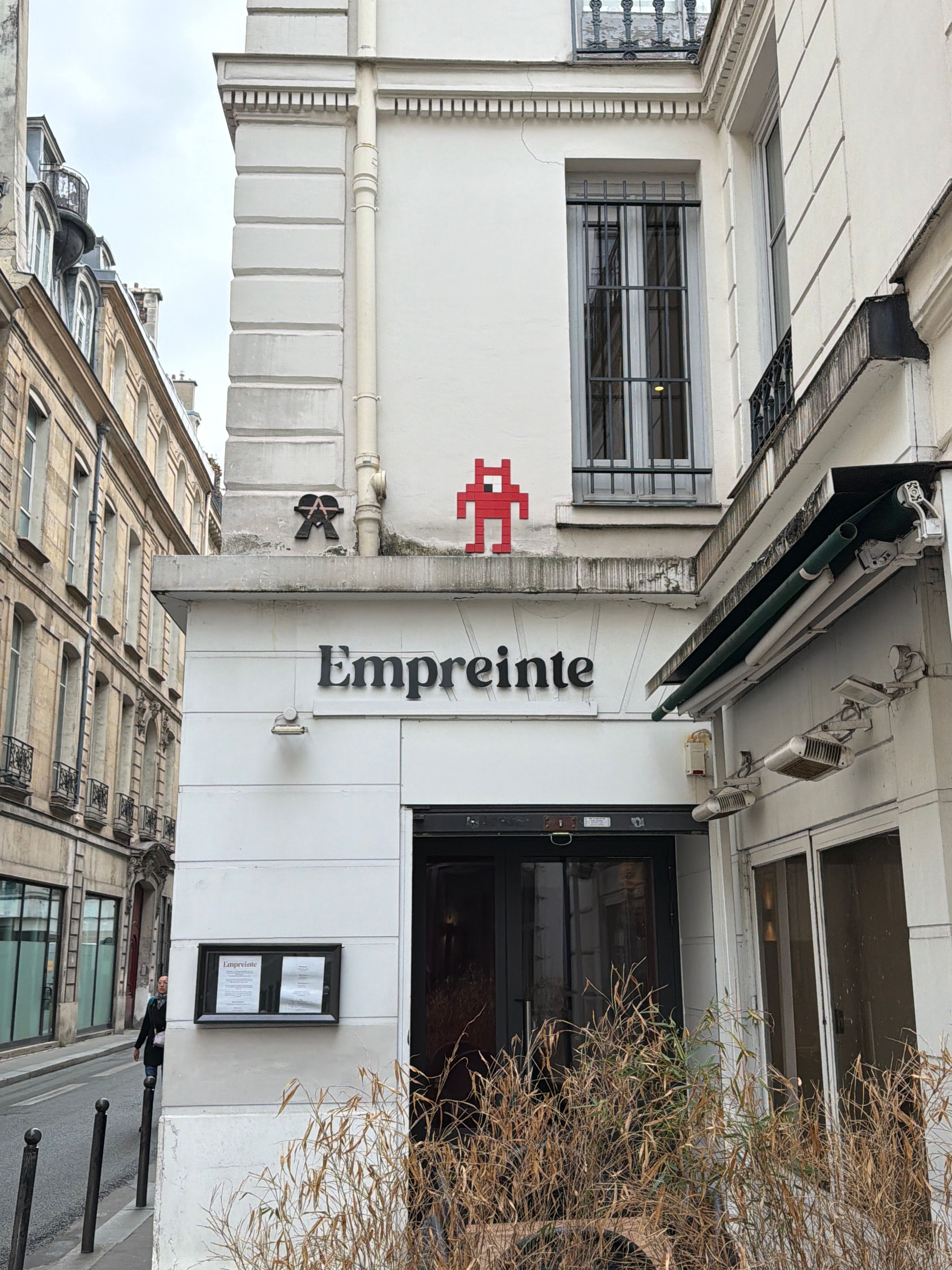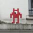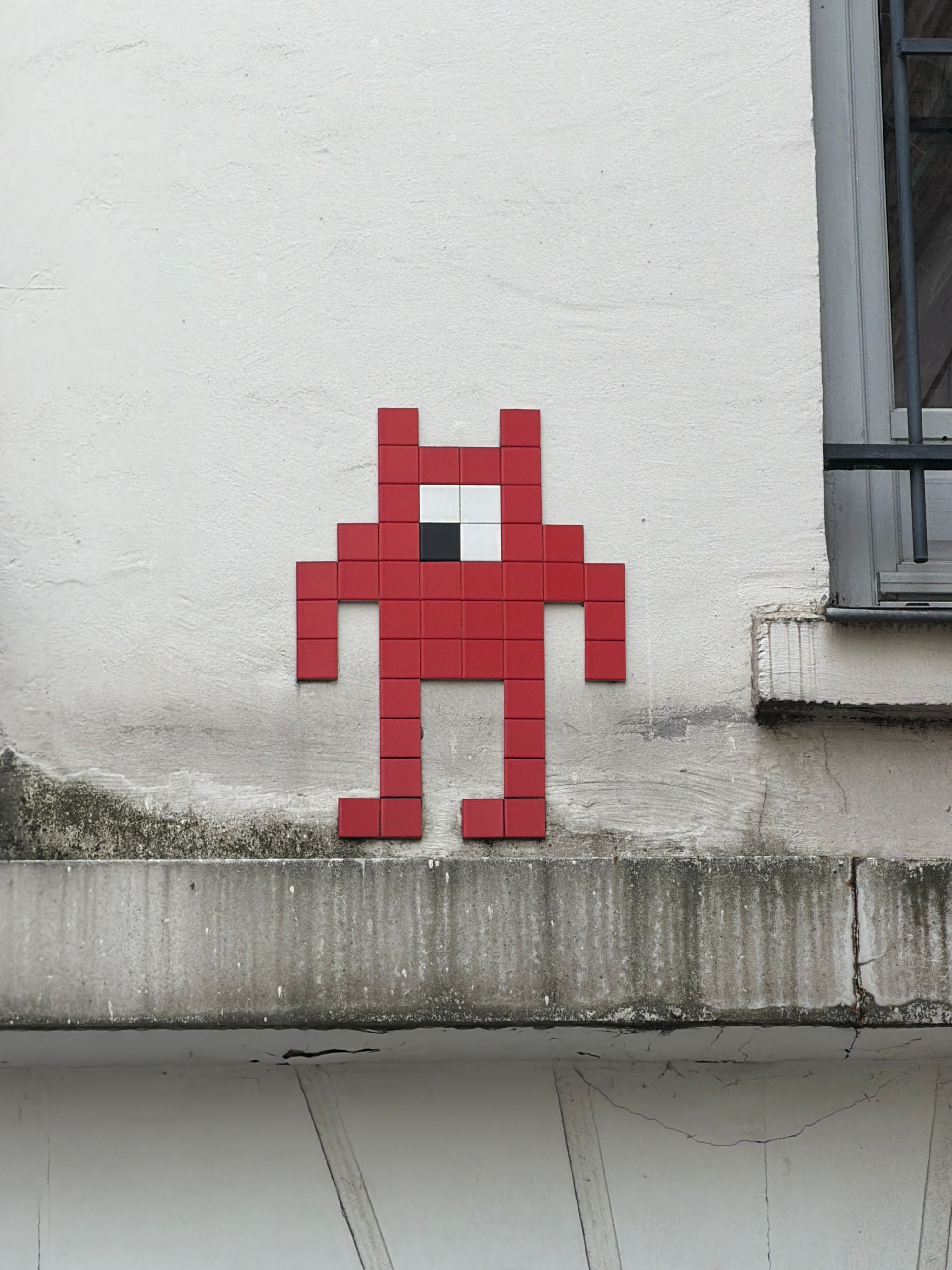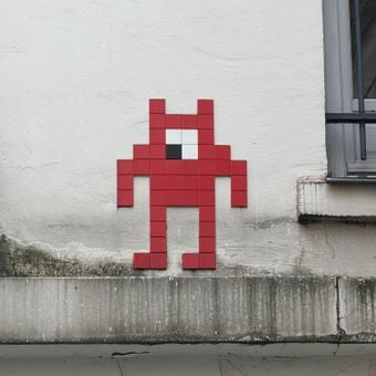 This artwork on a white wall depicts a red Berzerk with two arms, two legs, and two pointed ears. It has a large white square eye with a black center.