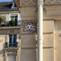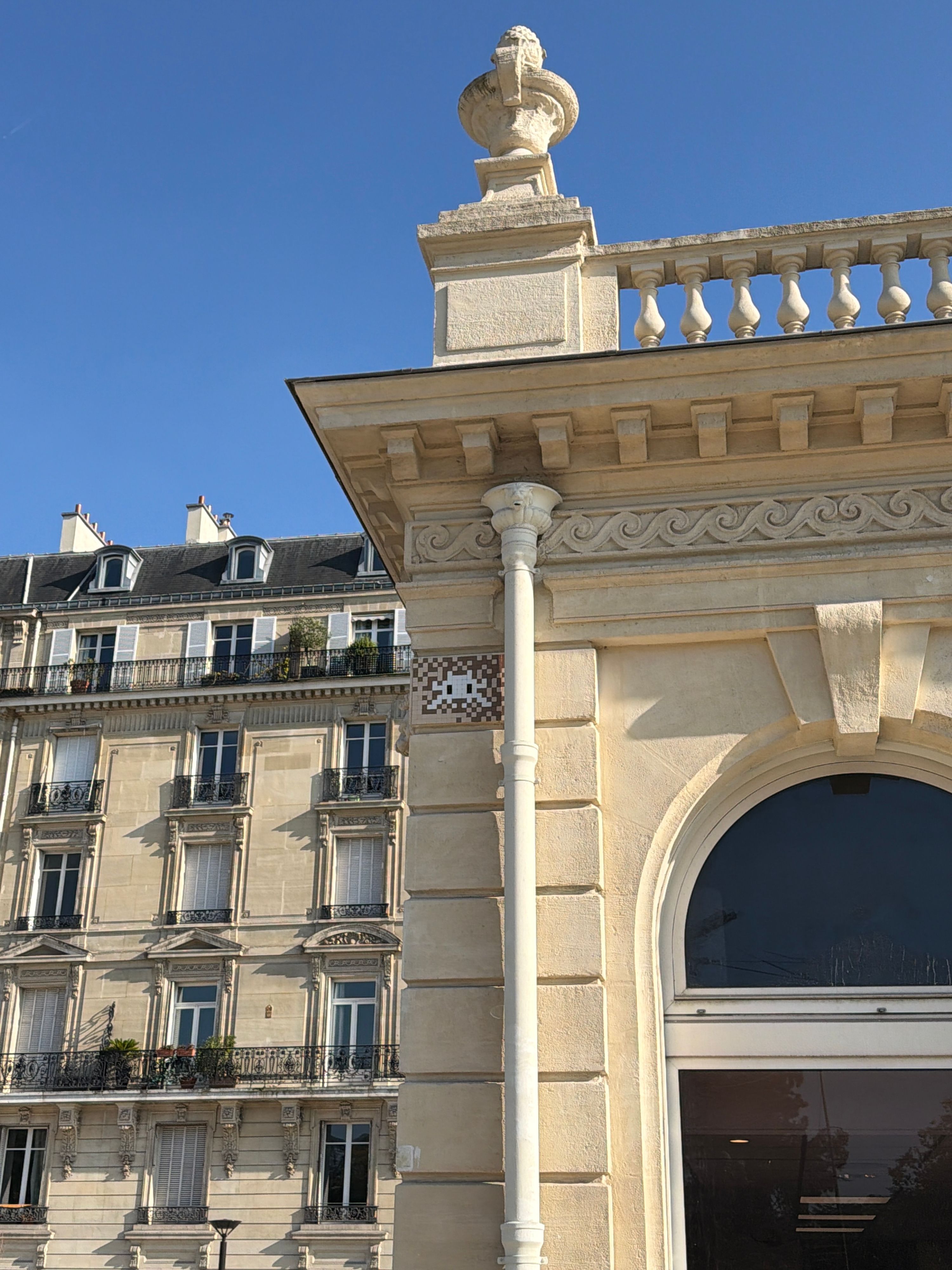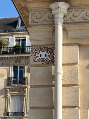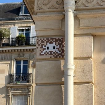 This mosaic by Invader shows a white alien figure with black eyes, surrounded by tan and beige squares, set against a stone wall.