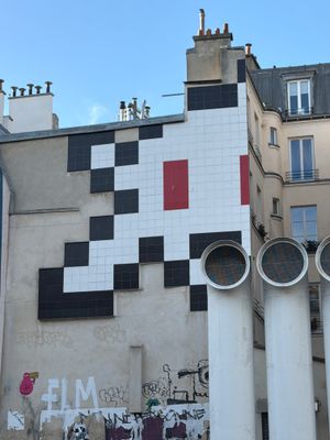 This large mosaic depicts a pixelated alien with black, white, and red tiles, forming an invader with two red eyes.