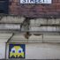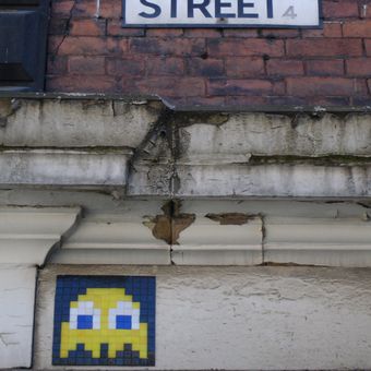 This work by Invader shows a yellow Pac Man ghost with blue and white eyes on a black square background. The shape has four lower extensions and looks abstract, made with small square tiles.