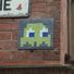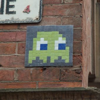 This mosaic shows a pixelated green Pac Man ghost with blue and white eyes, inspired by the video game Space Invaders. The artwork is made of small tiles and placed on a red brick wall.