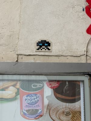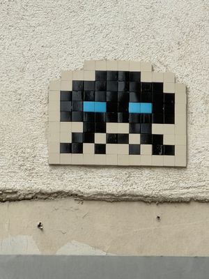 The mosaic shows a black figure with blocky white edges and two blue rectangles for eyes. The design uses small square tiles in black, white, and blue, forming an abstract creature shape on a light background.