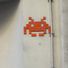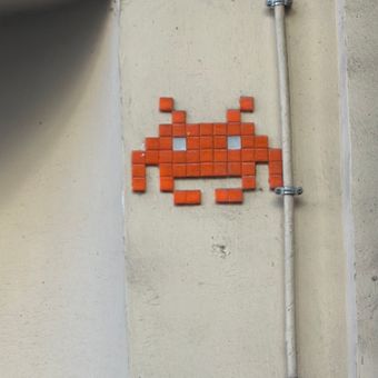 A small work made of square tiles forms a simple creature shape with two short antennae. The tiles are bright orange with two white squares as eyes.