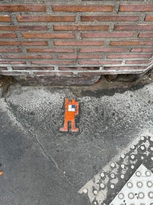 The artwork is made of small square tiles arranged in a standing figure. The tiles are mostly orange, with a blue and a white tile forming a rectangle at the center. The figure has blocky arms and legs and appears upright on a stone surface.