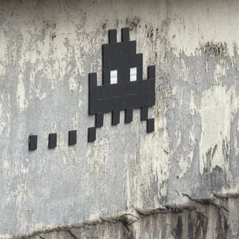 This mosaic shows a black pixelated alien shape with two bright white square eyes. The design is made with square tiles on a pale wall.