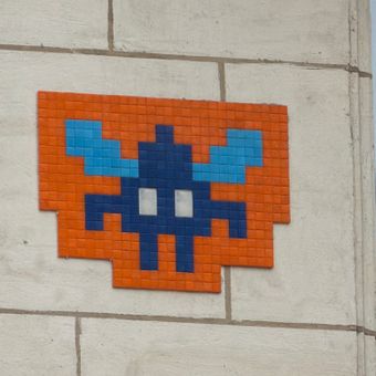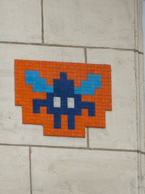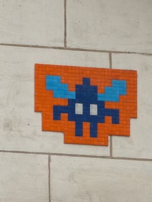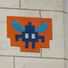 This mosaic shows a blue Galaxian creature with six legs and white eyes, placed on a bright orange background. The mosaic has a blocky, pixel-like design and is attached to a flat surface.