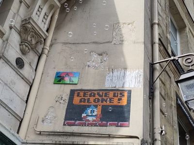 This artwork shows a small blue Bubble Bobble character holding a big orange sign with the words 'LEAVE US ALONE!'. The background is black, and there is a low platform with red, white, and purple color under the character.