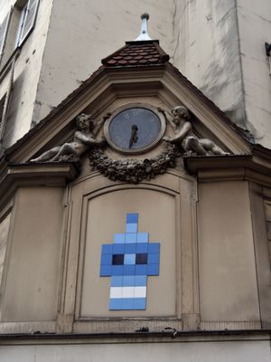 This artwork depicts a pixelated blue figure made with small tiles, with a dark band for the eyes in the middle and light tones at the bottom. The shape resembles a Futurama robot.