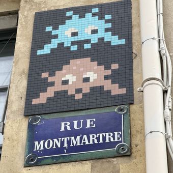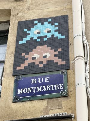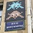 This mosaic by Invader at 130 Rue Montmartre shows two creatures made with small square tiles. The top figure is blue with white eyes, and the bottom one is light pink with white eyes, both displayed on a black background.