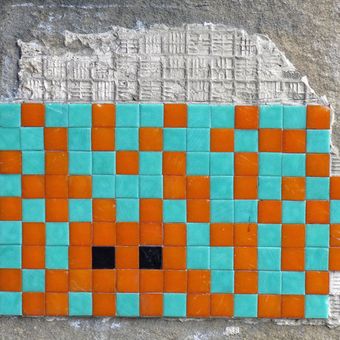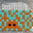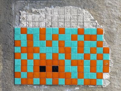 The mosaic shows a crab-like figure with a body made from square orange tiles and two small black squares for eyes on a background of pale blue tiles. The artwork is positioned on a stone wall near an arch and made from basic geometric shapes.