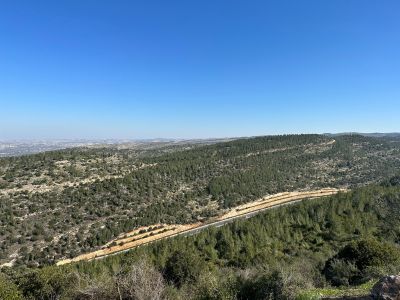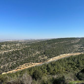 נקודת תצפית על שער הגיא עם ספסל שמשקיפה על כביש 1 ועל הרכס שמצפונו שכולל משלטים נוספים