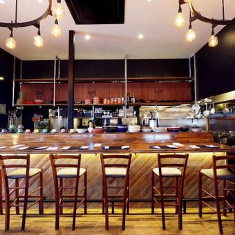 This dining establishment features three floors with approximately 80 seats total, offering various Japanese and international dishes in multiple dining spaces including semi-private box seats, counter seating, and open layout areas with warm wooden accents.