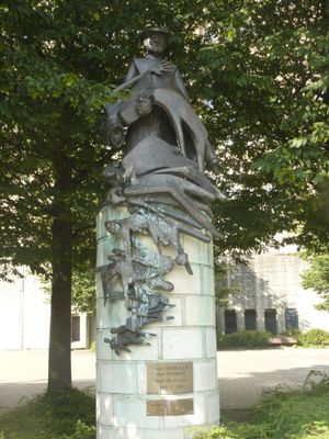The statue shows a tall bronze monument with abstract human forms and animals climbing up a stone base, located in Elisabeth Park near a basilica.
