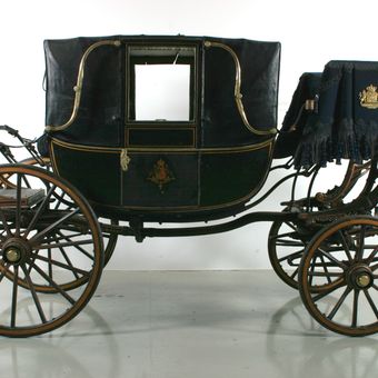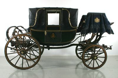 This landau is a four-wheeled horse-drawn carriage with a folding roof, featuring elegant woodwork and upholstered seating that can accommodate up to six passengers comfortably.
