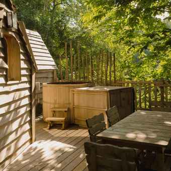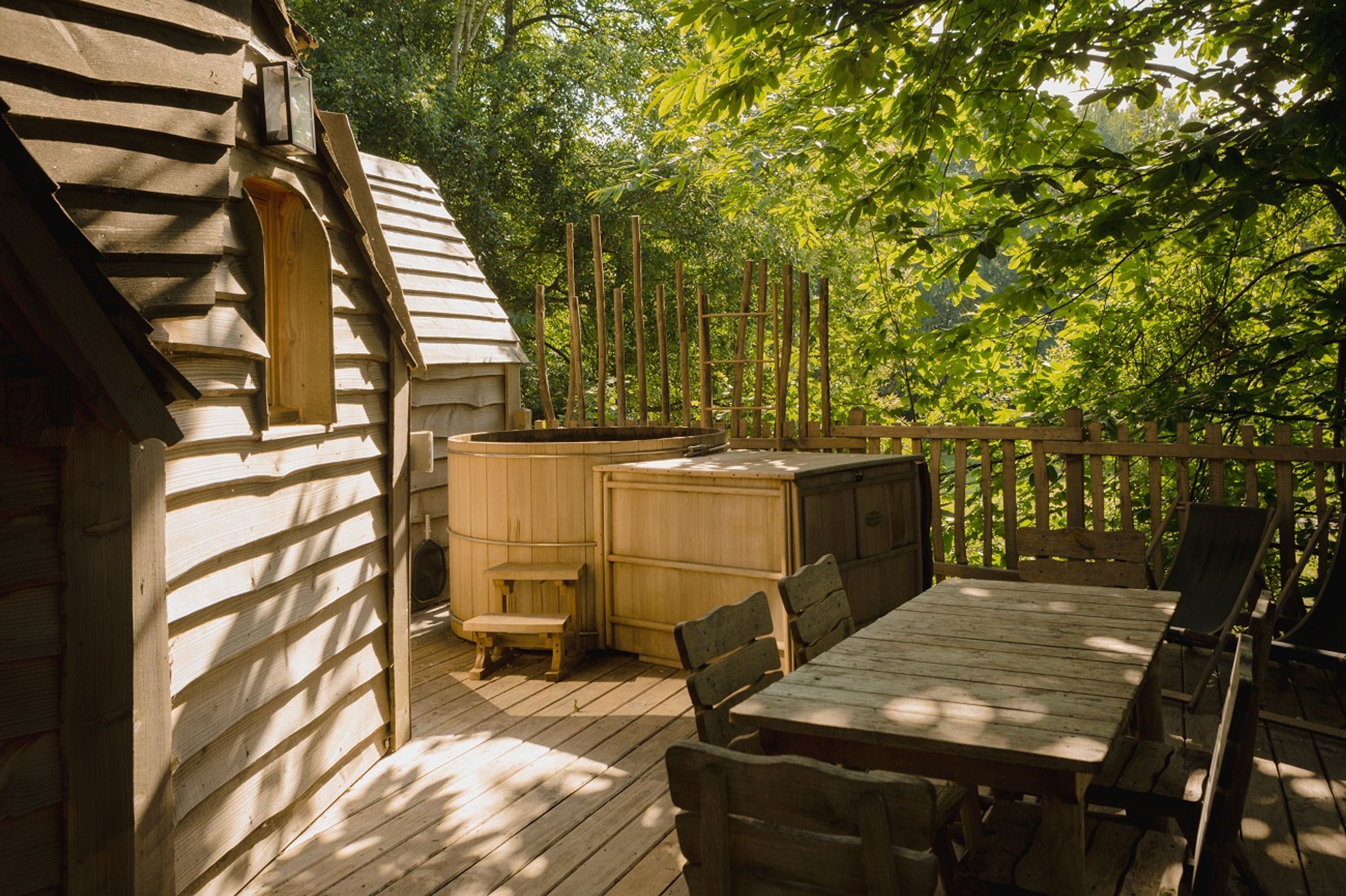 Several cabins feature private heated Nordic baths at 40°C installed on terraces, providing a relaxing spa experience suspended among the treetops.