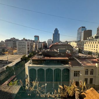 The complex showcases regional sculptures throughout its corridors and public areas, creating a visual connection to Chilean heritage while offering elevated city views from its rooftop pool area.