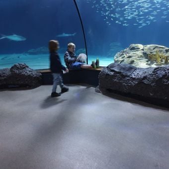 The aquarium creates a sense of being underwater as visitors walk past large glass tanks where sharks, sea turtles, and rays swim nearby. Families and school groups come here to explore and connect with ocean life in a calm, accessible way.