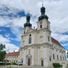 The Basilica of the Nativity of Mary in Frauenkirchen is a large baroque church with two domed towers and a soaring interior that reaches about 75 feet (23 meters) high. The building measures roughly 174 feet (53 meters) long and 59 feet (18 meters) wide, with eight small side chapels positioned along the main hall.