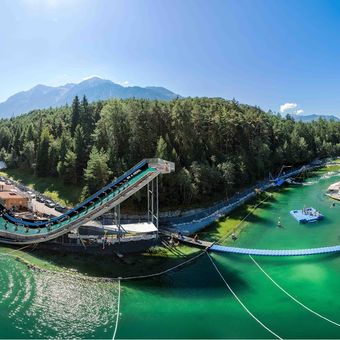 Area 47 is a large outdoor adventure park in Austria located in Roppen in the Ötztal, offering more than forty different activities across its grounds. The park features climbing areas, water sports zones, an indoor bike park, high ropes courses, and a lake suitable for swimming and wakeboarding, all set within a natural landscape of mountains and rivers.