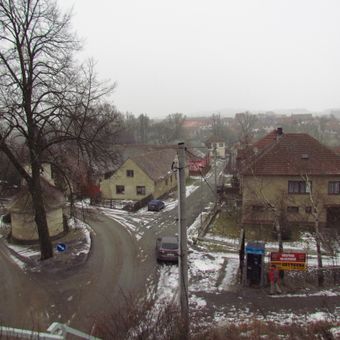 Kříž v křižovatce na návsi v Třebíčském Číchově