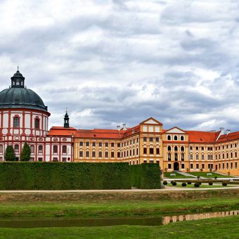 Jaroměřice Castle is a Baroque estate in South Moravia with a main residence, French-style gardens, and an English park laid out across the grounds. The Rokytná River runs through the property, creating natural boundaries and water features within the landscape.