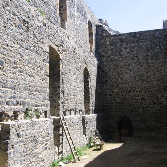 Radyně Castle is a ruin consisting of two rectangular towers linked by residential structures, standing at about 567 meters elevation on a hilltop. The remaining walls still display recognizable Gothic features from its original construction.