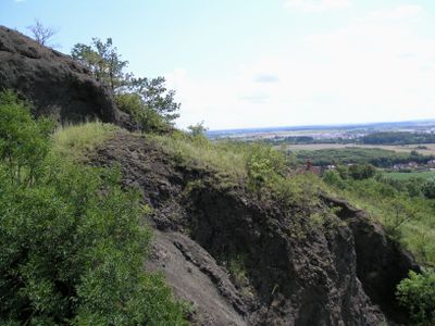 Zebín rises 399 meters above sea level as a conical neovolcanic hill featuring basaltic rock formations and an abandoned quarry on its southwestern slope.
