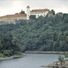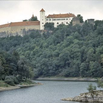 The castle stands on a steep promontory above the Želetavka River, featuring defensive towers and a complex architectural layout within its stone walls.
