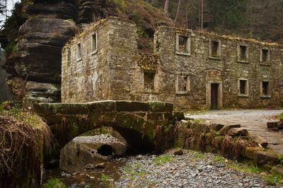 The stone remains of this old mill stand at the convergence of the Kamenice and Jetrichovicka Bela rivers in the National Park České Švýcarsko.