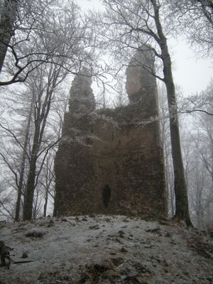 Kaltenštejn is a Gothic castle ruin near Černá Voda, consisting mainly of a round defensive tower and fragments of stone walls and fortification elements. The remains sit within the surrounding landscape and display the typical layout of a medieval defensive stronghold.