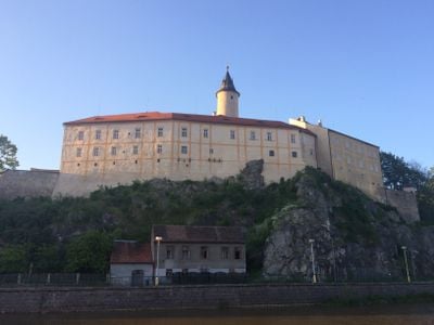 Ledeč nad Sázavou Castle sits on a limestone ridge overlooking the Sázava River, dominated by a tower reaching 32 meters in height that commands views across the surrounding landscape and town. The complex comprises multiple buildings arranged across the site, with exhibition spaces and museum areas throughout the grounds.