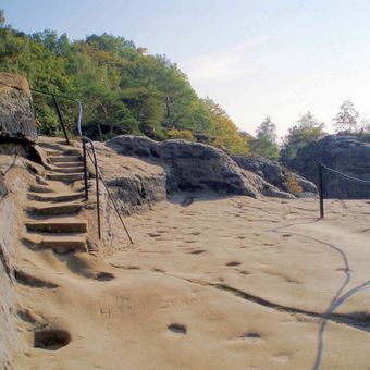 Drábské světničky is a medieval castle ruin made of sandstone blocks rising 177 meters (581 feet) above the Jizera River valley in the Bohemian Paradise region. The site features multiple chambers carved into the rock face, with the vertical cliff serving as a natural defense system.