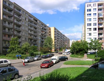 Černý Most is a residential area in Prague 14 composed mainly of large concrete apartment blocks and modern shopping centers. The district spans several square kilometers with a mix of residential buildings and commercial facilities organized in a compact urban layout.