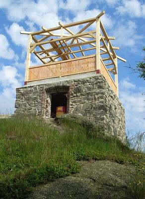 The Haselstein viewpoint stands at an elevation of 665 meters, offering views across the valleys and hills of the Ore Mountains region.