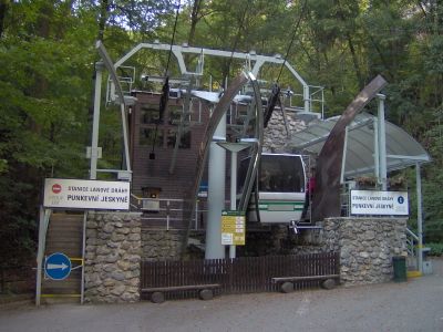 The Lanovka Punkevní jeskyně-Macocha is an aerial lift that connects the cave entrance with viewpoints overlooking the karst region while rising about 130 meters. The system carries passengers in roughly 2 minutes from the lower station to the upper platform, offering views of the surrounding limestone landscape.
