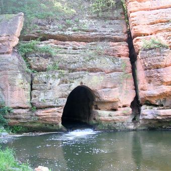 The Ploučnice River disappears completely into the underground passage known as Devil's Throat, emerging again on the other side of the rock formation.