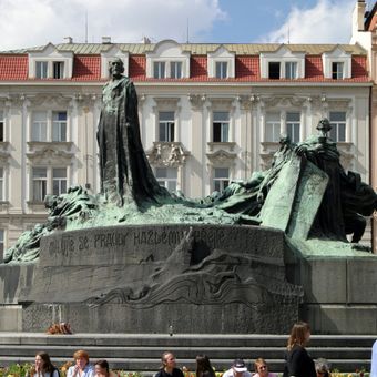 The Jan Hus Memorial stands as a central bronze monument with detailed figures representing Czech history on a granite pedestal in Prague.