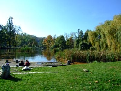Stromovka extends across 104 hectares of land, featuring numerous ponds, ancient oak trees, meadows, and walking paths throughout the green space.
