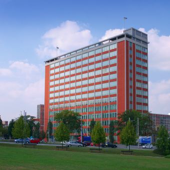 Architect Vladimír Karfík designed this administrative building in 1938 for the Baťa shoe manufacturer. It stood as one of Europe's tallest office buildings at the time and served as a visible symbol of the company's economic power.