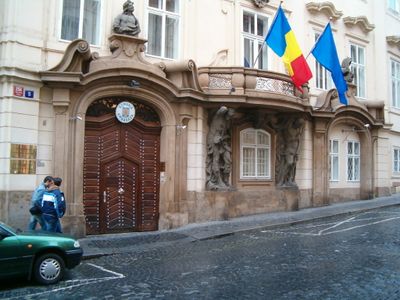 The building is viewable from the street during a walk through the neighborhood. Best views of the sculptural details come from standing directly on Nerudova Street where light reaches the columns clearly.